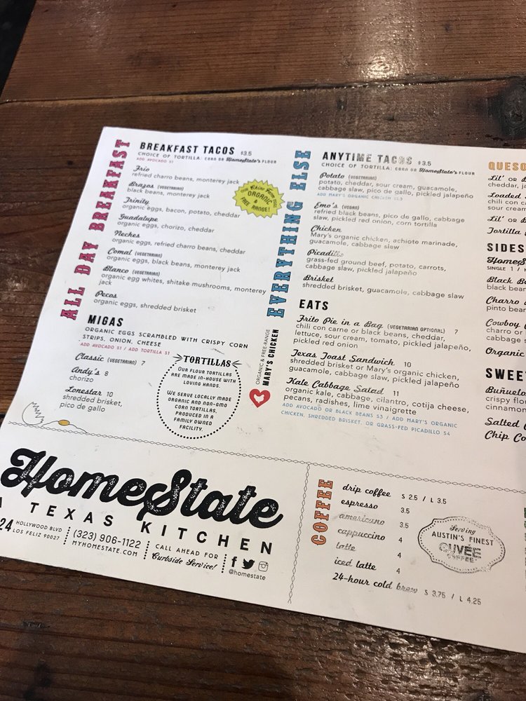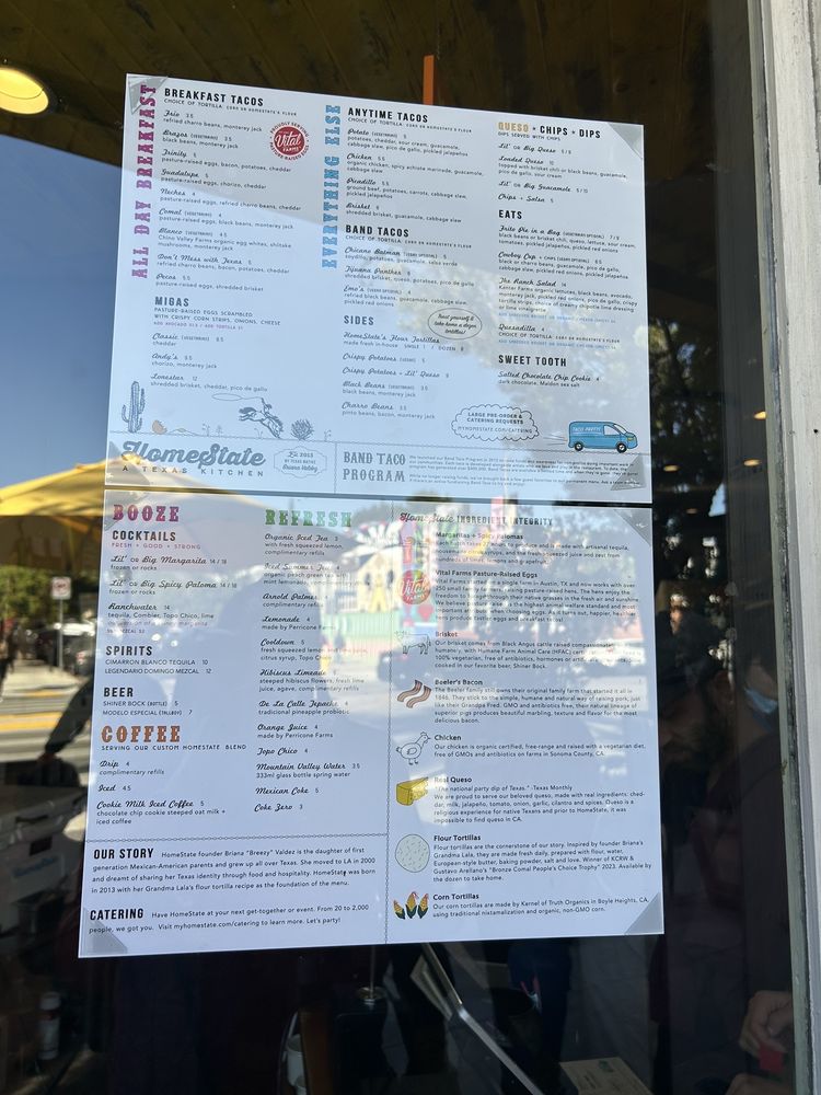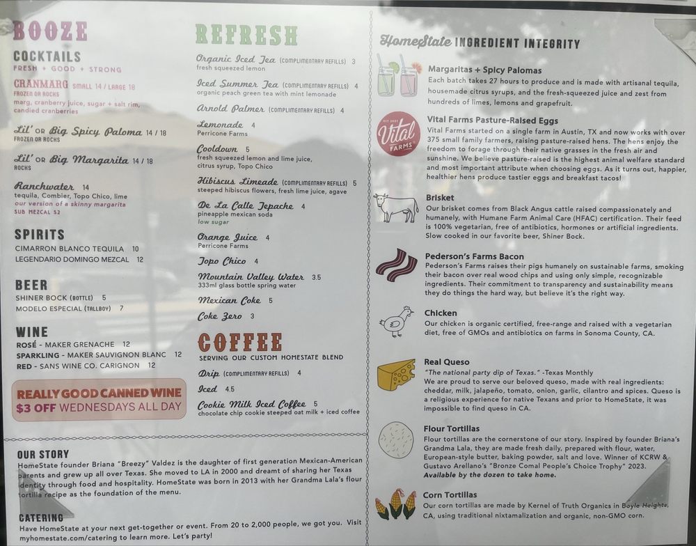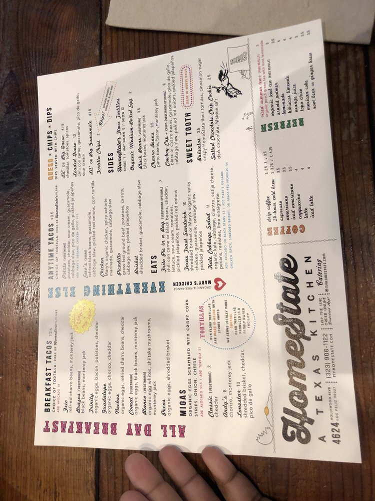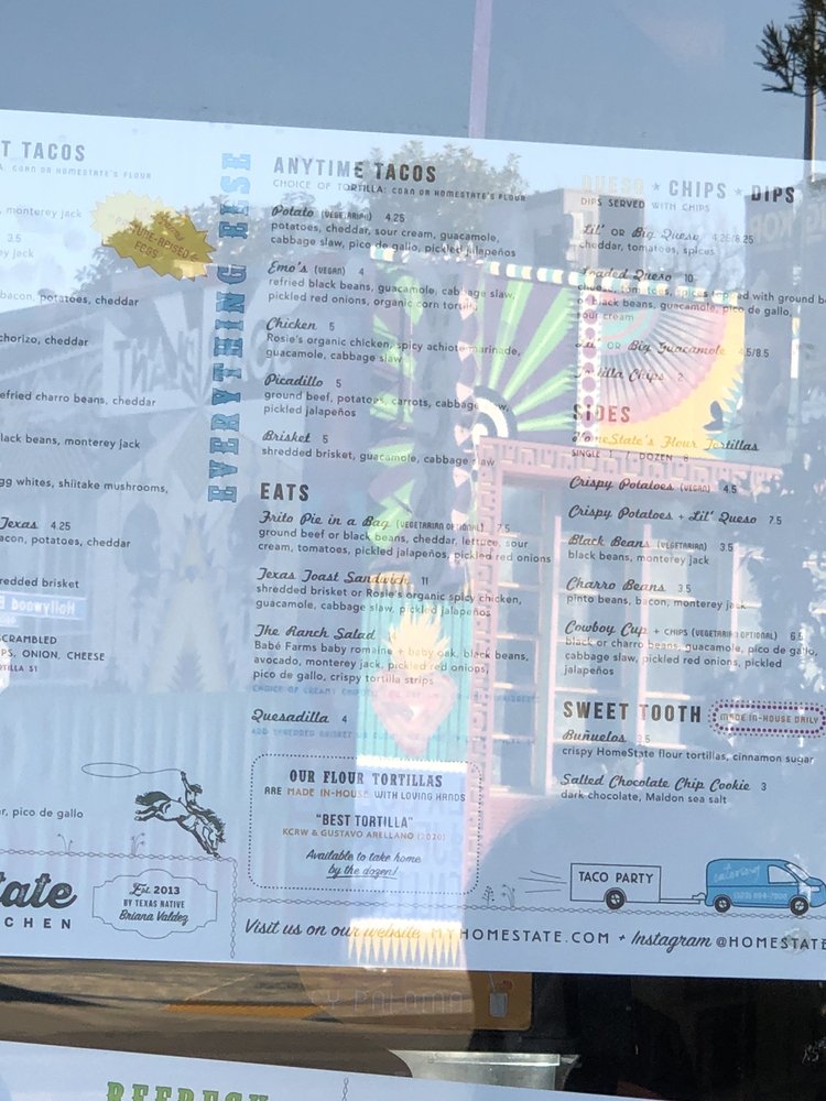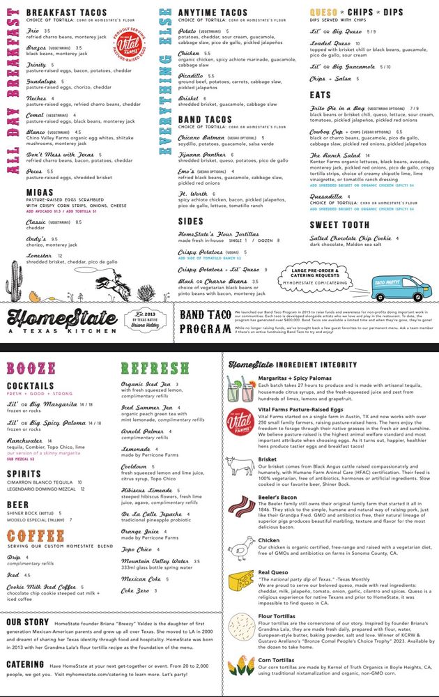 HomeState, located in Los Angeles, is a Tex-Mex gem known for its delicious breakfast and brunch options. With a diverse menu offering vegan and vegetarian choices, this Latinx and women-owned establishment boasts homemade tortillas and flavorful salsas. Customers rave about the mouthwatering breakfast tacos, like the Trinity and Pecos with brisket. The cozy ambiance, quick service, and reasonable prices make it a go-to spot for many. Don't miss out on their delectable brisket taco, potato taco, and large queso with chips. HomeState's commitment to sustainability shines through compostable containers and plastic-free packaging. For Tex-Mex favorites in a relaxed setting, HomeState is the place to be.