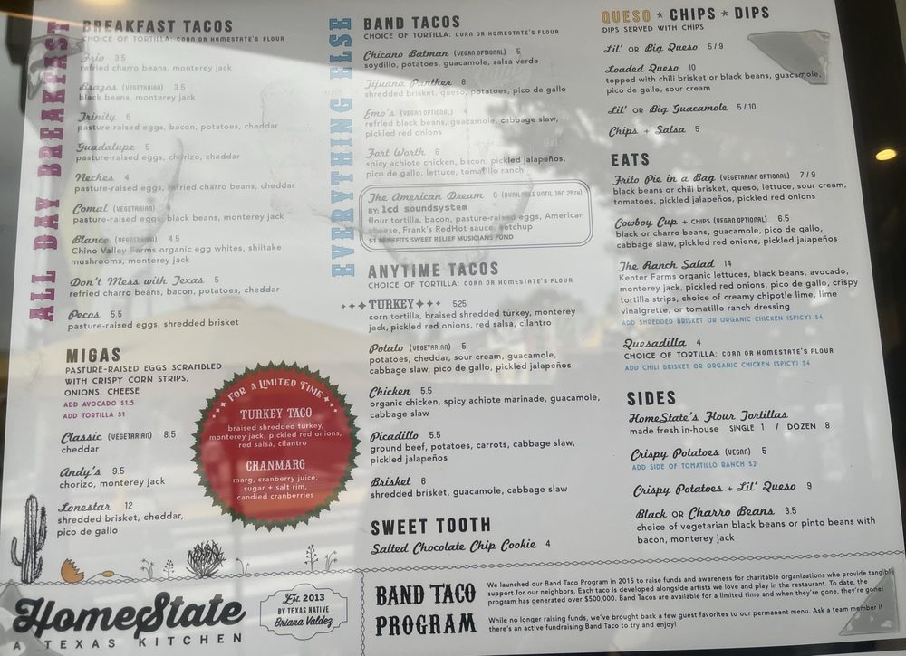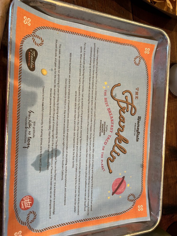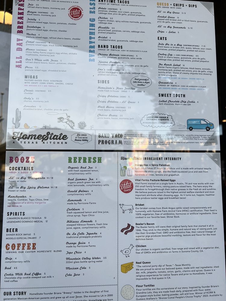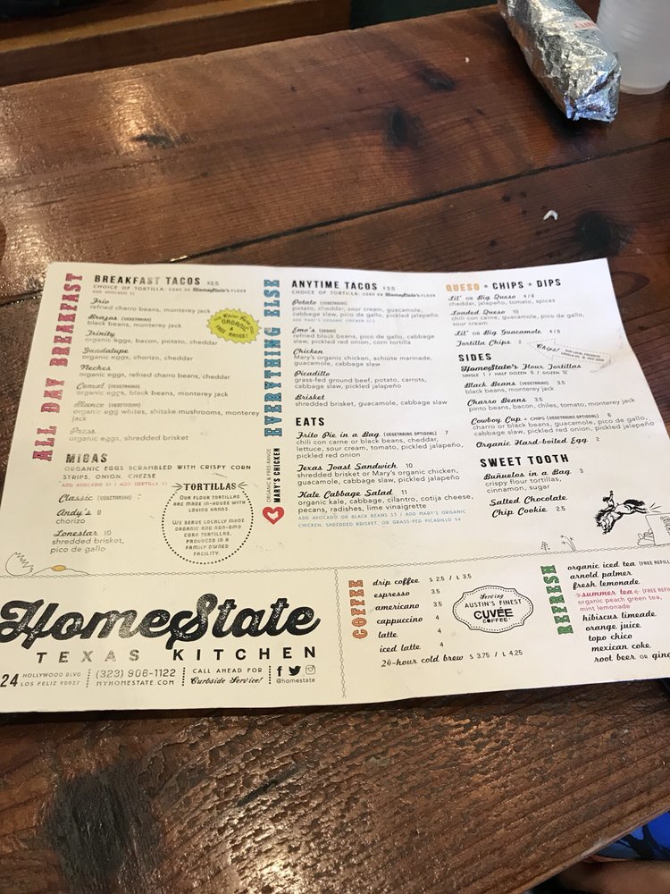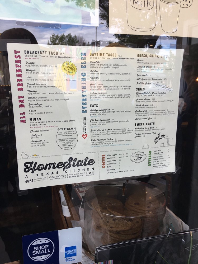 HomeState, located in Los Angeles, is a Tex-Mex gem known for its delicious breakfast and brunch options. With a diverse menu offering vegan and vegetarian choices, this Latinx and women-owned establishment boasts homemade tortillas and flavorful salsas. Customers rave about the mouthwatering breakfast tacos, like the Trinity and Pecos with brisket. The cozy ambiance, quick service, and reasonable prices make it a go-to spot for many. Don't miss out on their delectable brisket taco, potato taco, and large queso with chips. HomeState's commitment to sustainability shines through compostable containers and plastic-free packaging. For Tex-Mex favorites in a relaxed setting, HomeState is the place to be.
